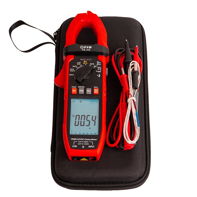 The TIS 418 is a TRMS 600A AC/DC clamp meter which is supplied with a host of features, for the everyday electrician or maintenance electrician. These include AC/DC current, frequency, capacitance, resistance, duty cycle, temperature -40°C to 1000°C, complete with thermocouple. Other features include max/min hold, auto power off, auto ranging, continuity buzzer, data hold, work light, back light and non contact voltage test.